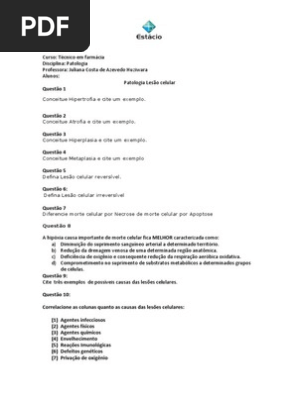 Lista De Exercício Fisiopatologia Lesão Celular Com Gabarit