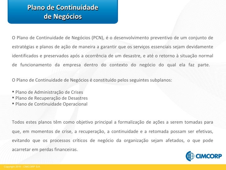 Agora é hora de começar a trabalhar na implementação do. O plano de continuidade de negócios pcn do inglês business continuity plan bcp estabelecido pela norma abnt nbr 15999 parte 1 é o desenvolvimento preventivo de um conjunto de estratégias e planos de ação de maneira a garantir que os serviços essenciais sejam devidamente identificados e preservados após a ocorrência de um desastre e até o retorno à situação normal de.