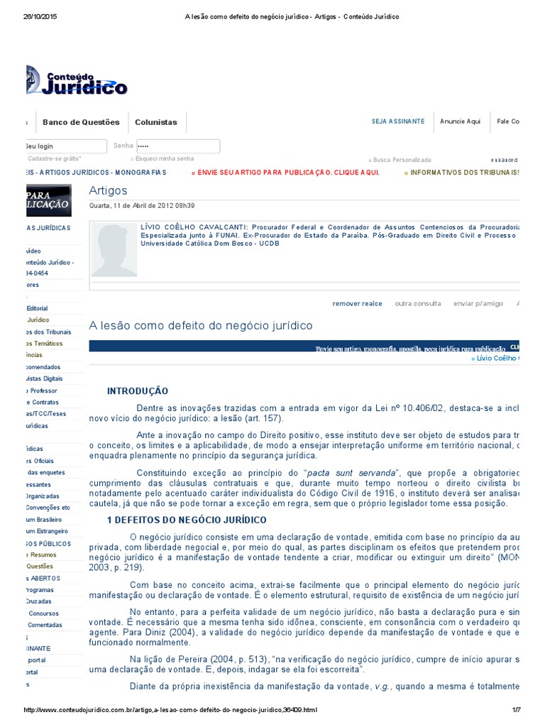 A Lesão Como Defeito Do Negócio Jurídico Artigos