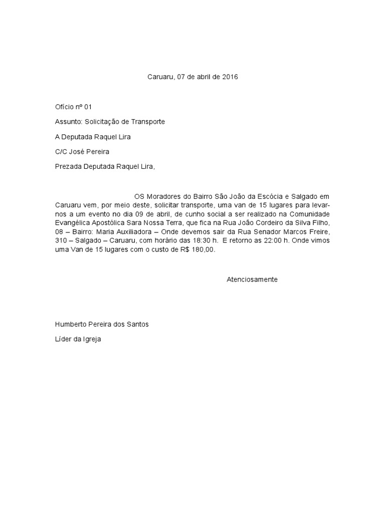 Modelo Ofício Para Solicitação De Transporte